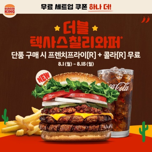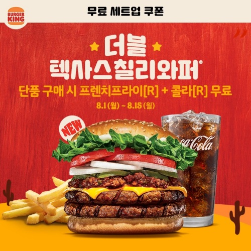 스태커2 와퍼의 텍사스칠리 버전인 더블 텍사스칠리 와퍼 무료 세트업 쿠폰도 있습니다. 단품 가격에 세트로 드실 수 있는 것이죠. 쿠폰은 아래 링크 누르면 받아집니다.
